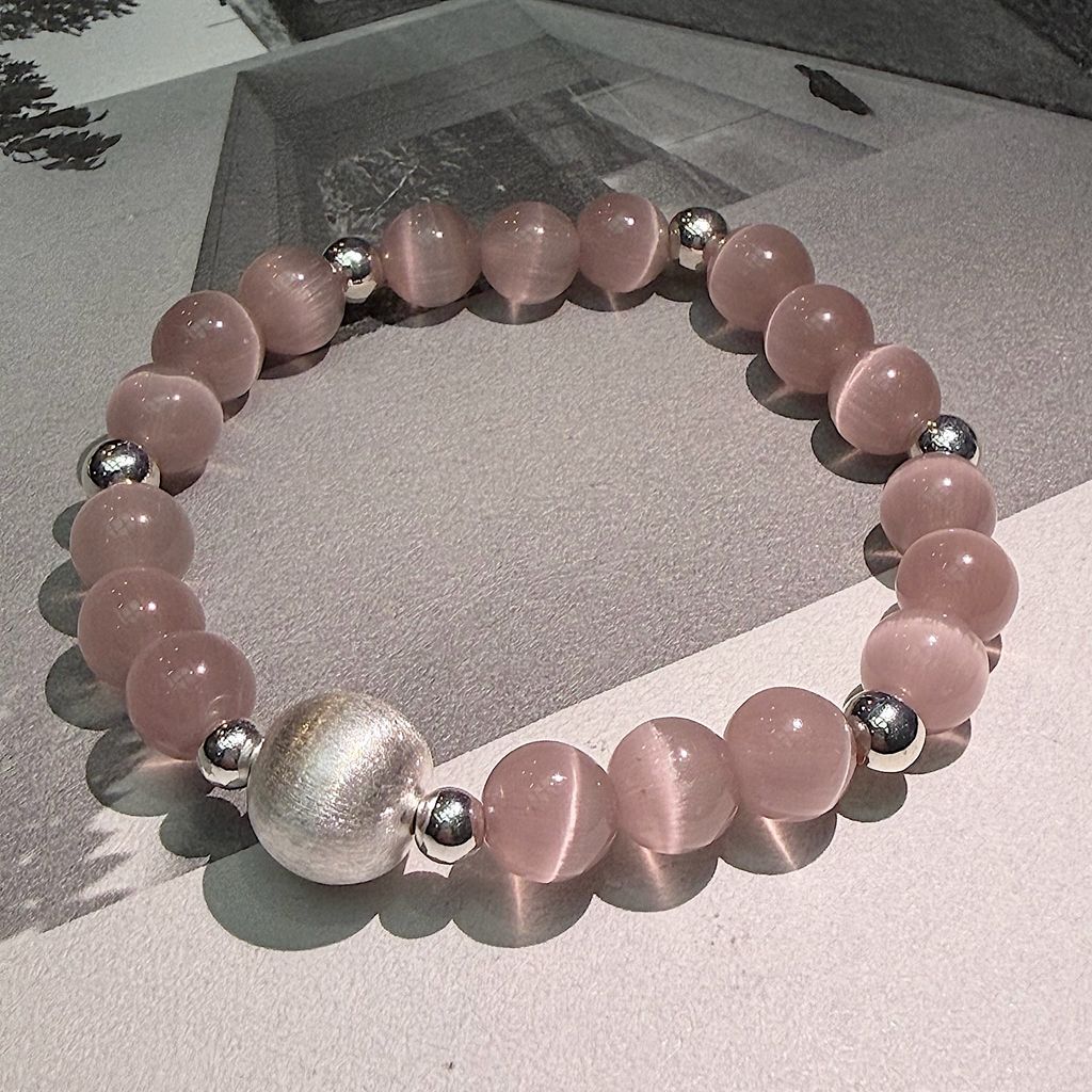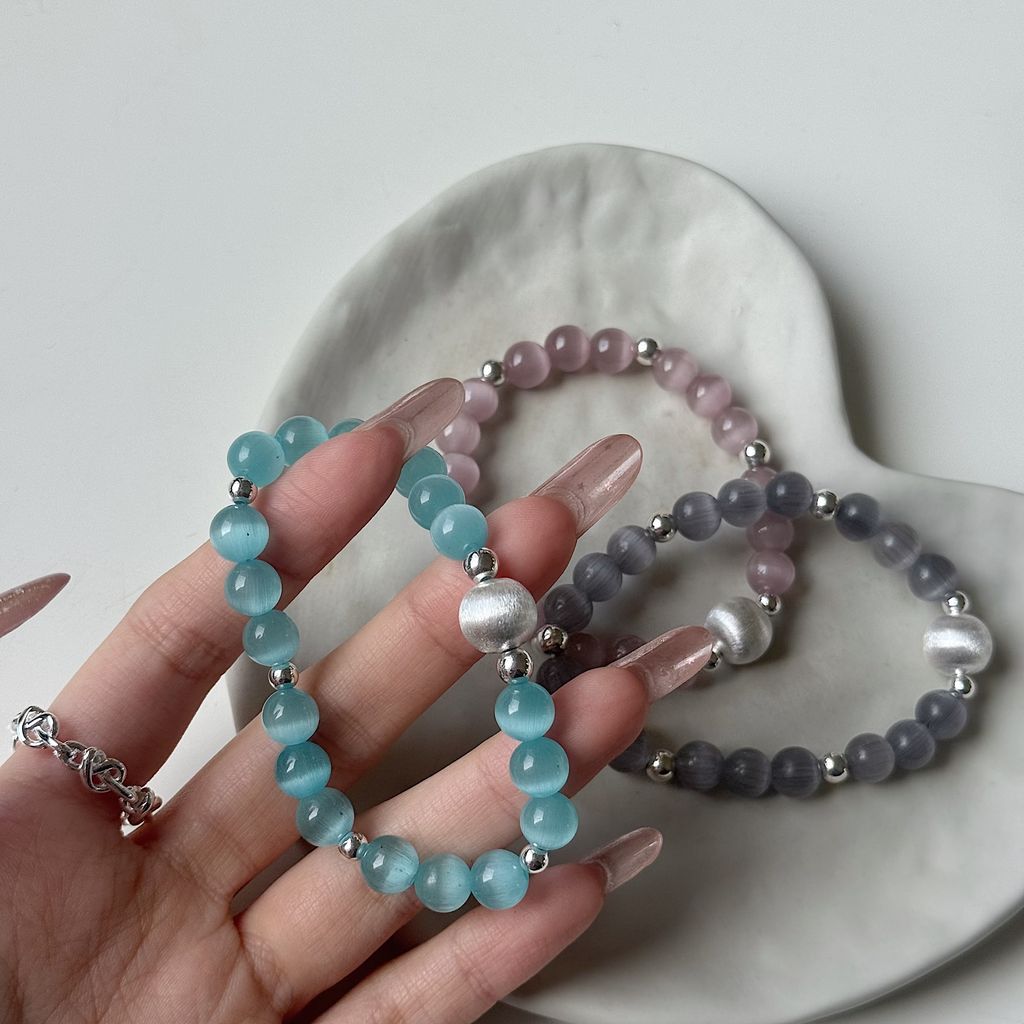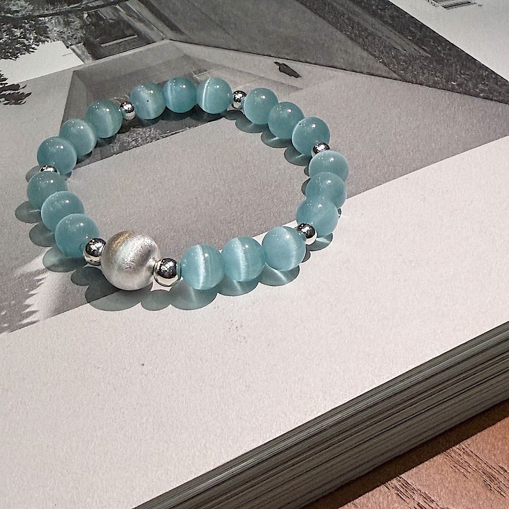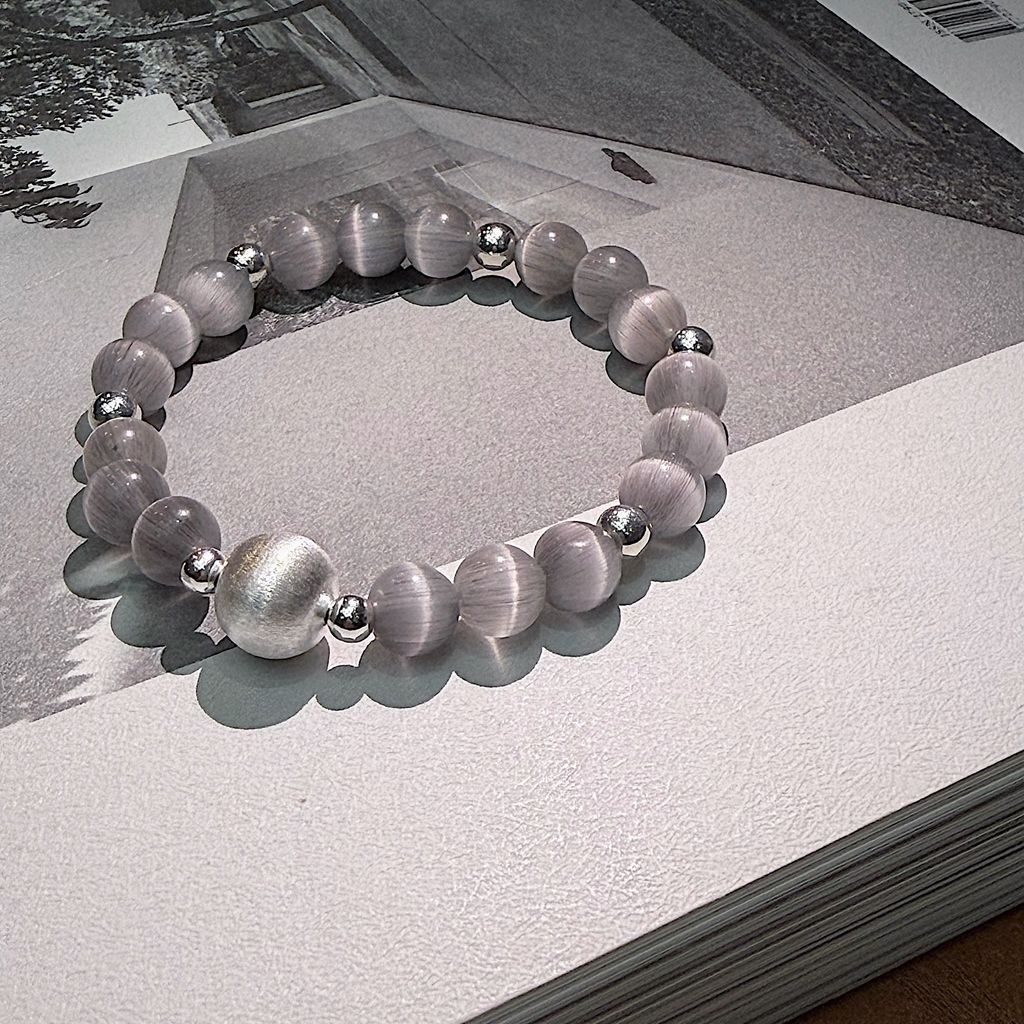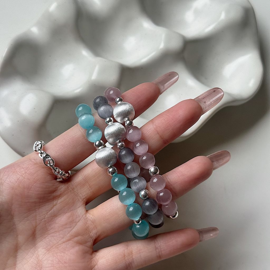 不同顏色的貓眼石在光影間閃爍變化,純銀珠點綴,散發迷人寶石感